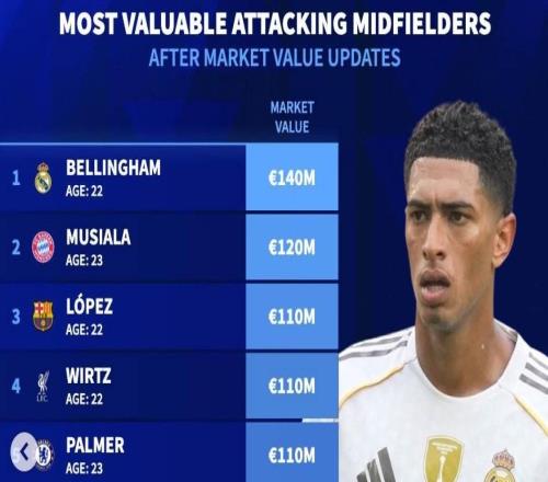征途国际:德转世界足坛前腰身价前10:贝林1.4亿第1,穆西亚拉1.2亿第2