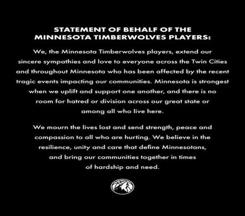 征途国际 ,明尼苏达森林狼的球员们,向双子城(明尼阿波利斯和圣保罗)及整个明尼苏达州所有受到近期社区悲剧事件影响的人们,致以诚挚的慰问与深切的关怀。明尼苏达州最强大的时刻,在于征途国际 彼此扶持与激励;在征途国际 伟大的州境内,在所有居住于此的人们心中,都不应给仇恨或分裂留下容身之所。