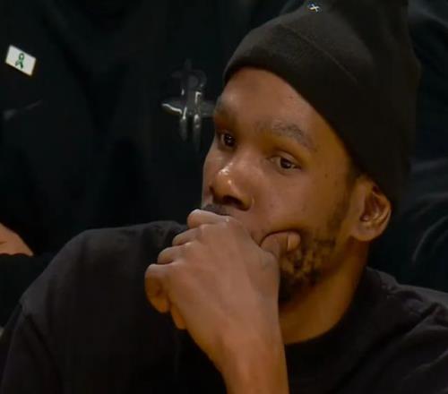 比赛最后时刻,胜负已定之后,转播镜头给到了场边的杜兰特;冷漠表情下,没有人知道他的伤情到底如何,甚至下一场能不能回来,都是一个问号。