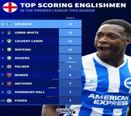 本赛季英超英格兰球员进球榜:维尔贝克13球居首,帕尔默在列