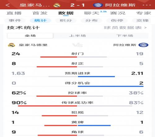 皇马21阿拉维斯全场数据:射门2419,射正85,得分机会02
