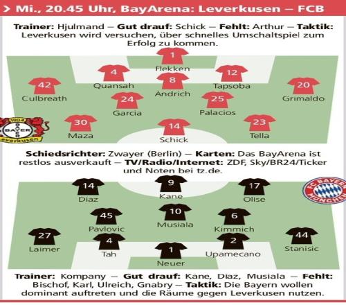 体育播报4月22日宣 勒沃库森将在本轮德国杯半决赛坐镇主场迎战拜仁,《踢球者》预测了双方首发阵容。