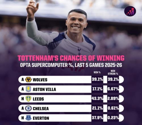 OPTA也对此进行了分析预测,他们统计显示热刺最后5轮的赛程难度相对轻松,在各队赛程难度位列第15位。但想要打出5连胜的几率仍然微乎其微。