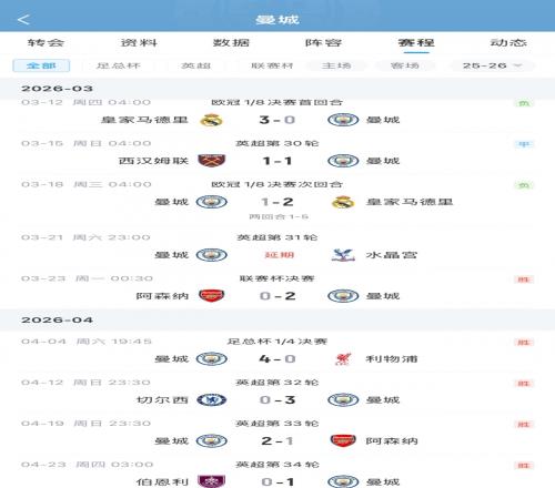 3月中旬至4月中旬,曼城经历魔鬼赛程,4条战线上7场比赛要两战皇马和阿森纳、连战利物浦和切尔西。