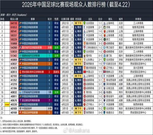 2026年中国足球比赛现场观众人数排行榜(截至4.22)
