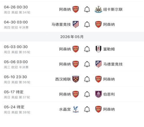 而阿森纳队在英超联赛的最后五个对手分别是纽卡斯尔联队、富勒姆队、西汉姆联队、伯恩利队和水晶宫队。表面上看,阿森纳队的争冠之路似乎同样容易,但不要忘记阿森纳队还有两场与马德里竞技队的欧冠半决赛加插在其中,这也让阿森纳队在剩余的时间里背负了更多的比赛。