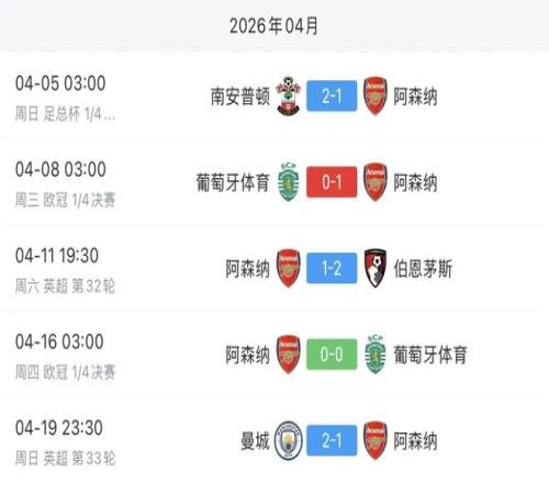 反观阿森纳队在整个四月的赛程中,表现并不如人意。直至目前的五场比赛中,阿森纳队仅取得一场比赛的胜利,还是在欧冠赛场上!在英超方面,阿森纳队则是遭遇了两连败!其中就包括了在天王山之战中,输给了曼城队。