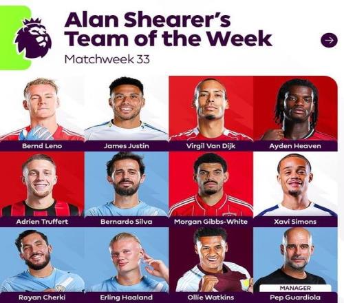 英超官方发布了阿兰-希勒评选的本周英超最佳阵容,哈兰德、谢尔基、范戴克、海文等人在列。