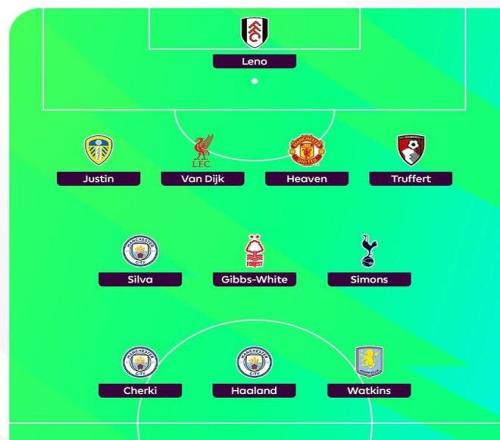 前锋:谢尔基(曼城)、哈兰德(曼城)、沃特金斯(维拉)