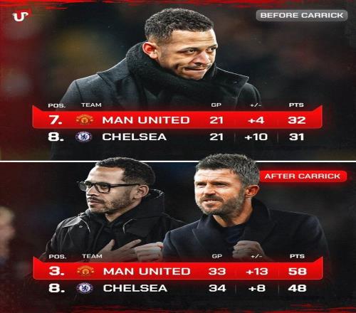数据显示,索帅转正前,曼联19场比赛豪取14胜;但他被官宣成为正式主帅后,曼联最后10战只有两胜,却输了6场,最终无缘欧冠资格。现在,卡里克执教前12场赢下8场,球队有机会重返欧冠,但俱乐部计划等到赛季结束后再决定是否让其留任。