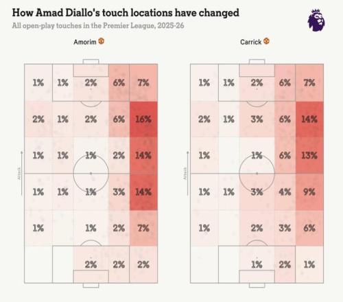 阿马德则被要求更多地内收活动。下方图表显示,在阿莫林时期担任边翼卫时,他在控球时更贴近边线,角色更加明确。而在卡里克手下,他的触球分布不再集中在特定区域,而是被要求更加灵活、多变。