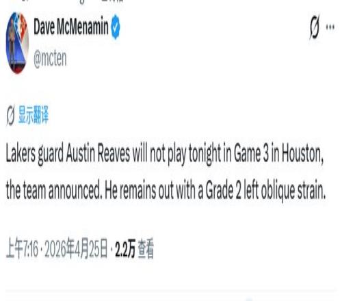 再说杜兰特的情况:这位火箭核心先是右膝挫伤导致G1缺阵,又在G2比赛中扭伤左脚踝,连续伤停。杜兰特缺席,会让火箭回到主场后的翻盘希望愈发渺茫;而湖人这边里夫斯即便不能立刻复出,整体形势也牢牢占优。