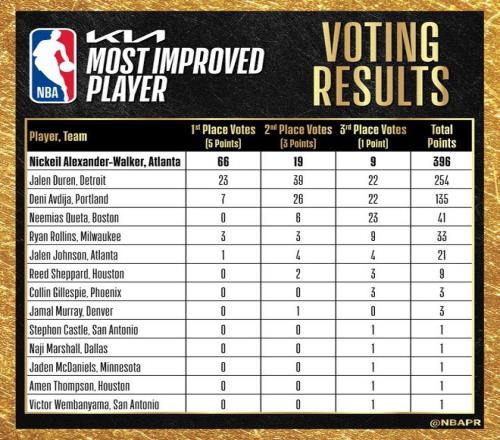 年度进步最快球员奖,设立于1985-86赛季。NBA历史至今,获得该奖项最多的球队是步行者和魔术,两队各有5人获得过这一奖项。字母哥、莫兰特、马克西、马尔卡宁、英格拉姆、巴特勒、乔治等现役球星都曾当选过进步最快球员。