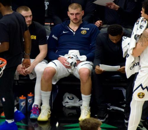 小阿德尔曼这场比赛提前4分10秒投子认负,约基奇、穆雷等主力下场后掘金的板凳席非常沉寂,约基奇的表情也很落寞、沉重,助教在一旁看数据统计,约基奇面对四届DPOY连连吃瘪。