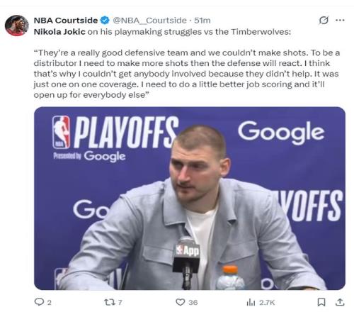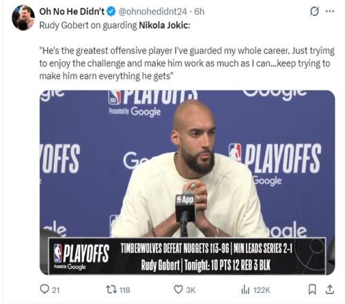 戈贝尔则这样评价约基奇:他是我职业生涯防守过最出色的进攻球员,我只是在享受这个挑战,我觉得我用了所有方法,我相信努力会获得回报。