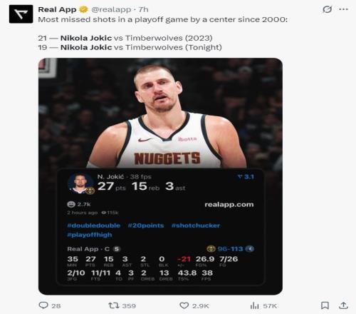 2.约基奇成为2000年后中锋单场季后赛投丢最多的球员前二,这场19球,上一场是2023年约基奇VS森林狼投丢了21球;