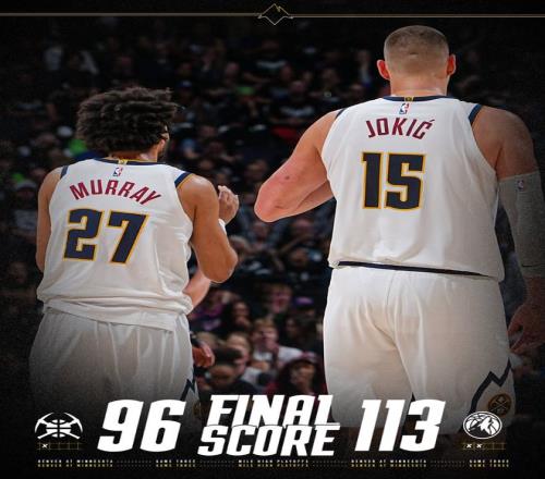 掘金96-113惨败森林狼,大比分1-2落后。这场比赛明尼苏达森林狼是完胜,在核心爱德华兹因为膝伤只打24分钟的情况下,森林狼全队6人上双+两人20分以上,而掘金只有4人上双且只有约基奇拿下20分以上,只可惜约基奇的命中率实在是太低了。