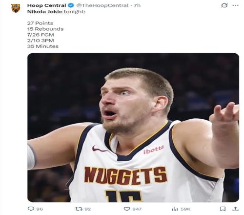约基奇此役全场比赛35分钟,26中7,三分10中2,拿到27分15篮板3助攻2抢断4失误,命中率26.7%,三分命中率20%,真实命中率43.8%,正负值-21(全队最差)。