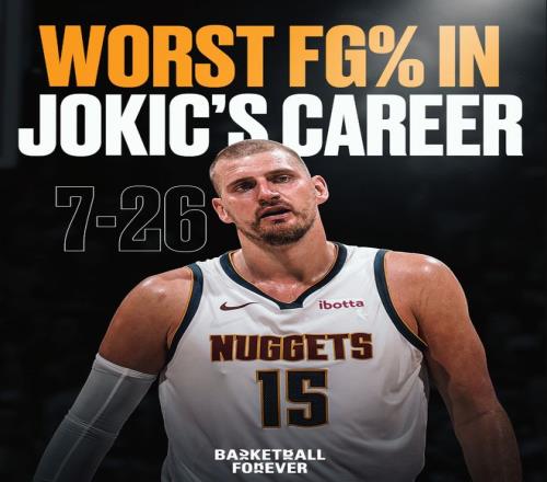 此役约基奇吃下了两项耻辱纪录:1.约基奇季后赛命中率26.7%职业生涯最低一场;