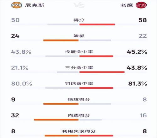 从半场的数据上来看,老鹰之所以取得领先优势,主要还是因为他们将对手的三分球命中率限制得只在21.1%,半场尼克斯仅投进4记三分球;老鹰在罚球数量上也占据优势,半场以16-5足足领先尼克斯11次罚球。当然,这也给尼克斯下半场的比赛提供了优化的办法,那就是多冲击禁区造杀伤,同时延续第二节末段的进攻势头。