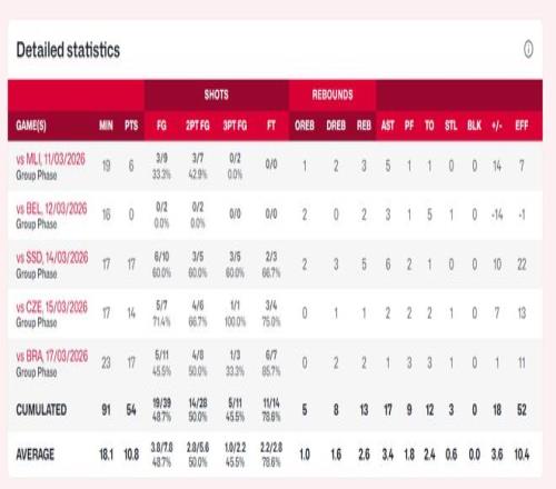 G3全场19.3分钟,5中3,三分1中1,拿到7分3篮板3助攻3抢断1失误;