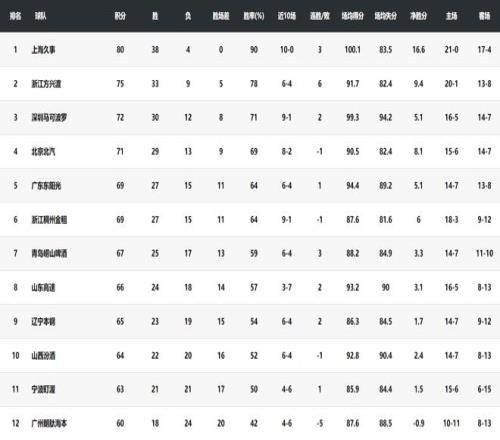 上海38胜4负、广厦33胜9负、深圳30胜12负、北京29胜13负、广东27胜15负、浙江27胜15负、青岛25胜17负、山东24胜18负、辽宁23胜19负、山西22胜20负、宁波21胜21负、广州18胜24负。