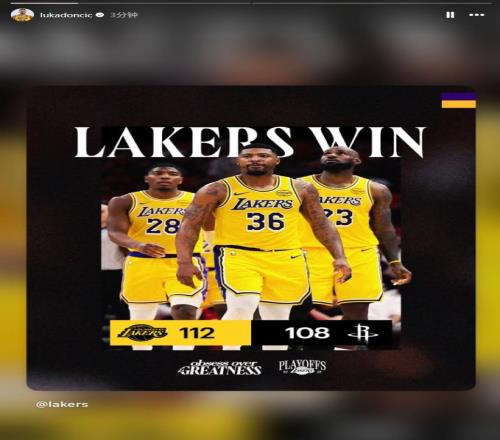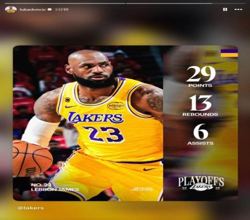 东契奇更新社媒转发湖人赢球海报和詹姆斯29+13+6数据海报