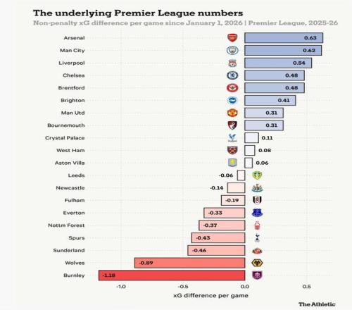 纵观全赛季,阿森纳基础数据更占优,场均预期净胜球为0.86,曼城为0.73。而进入新年以来,双方差距大幅缩小,阿森纳仅微弱领先。