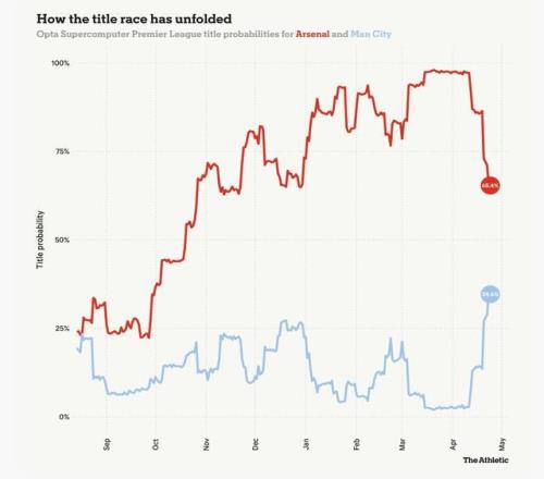 本月初,Opta超级模型曾极度看好阿森纳,预测其终结22年冠军荒的概率高达97%。但随着近期局势剧变,这一概率已暴跌至65.4%。