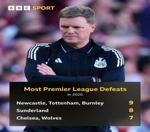体育播报4月26日宣 BBC列出2026年英超输球场次排名,纽卡、热刺、伯恩利输掉9场联赛最多。