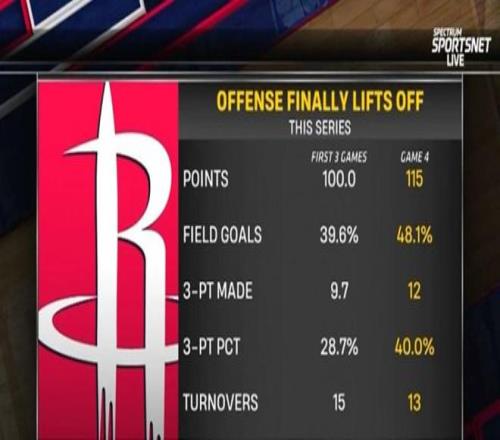 而本场背水一战,放下心理负担的火箭队反而找到三分手感,投出40%的三分命中率远优于前三场。