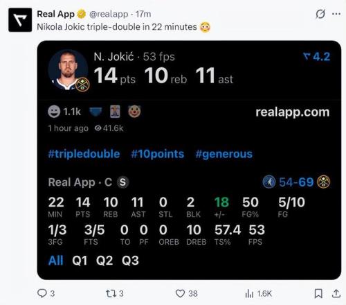 第三节约基奇仅仅出战3分钟就完成了三双,22分钟已经拿到14分10篮板11助攻,这是约基奇季后赛生涯第23次三双,约基奇常规赛198次三双+季后赛23次三双追平威少总数221次并列历史第一。