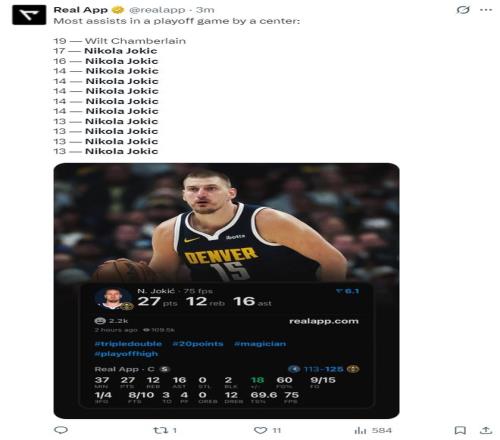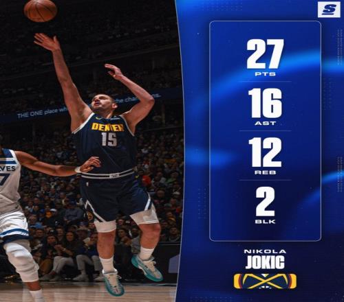 全场比赛,约基奇37分钟, 15中9,三分4中1,拿到27分16助攻12篮板2盖帽,命中率60%,真实命中率63.9%,正负值+25。