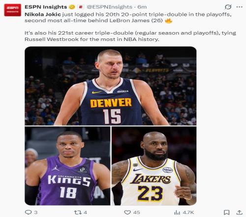 4.约基奇第20次季后赛20+三双仅次于詹姆斯26次历史第二;