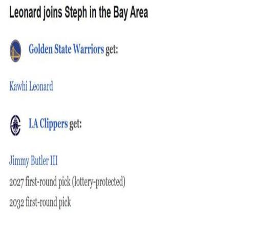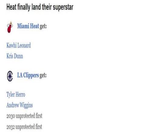 快船得到:希罗+维金斯+30年无保护首轮+32年无保护首轮。