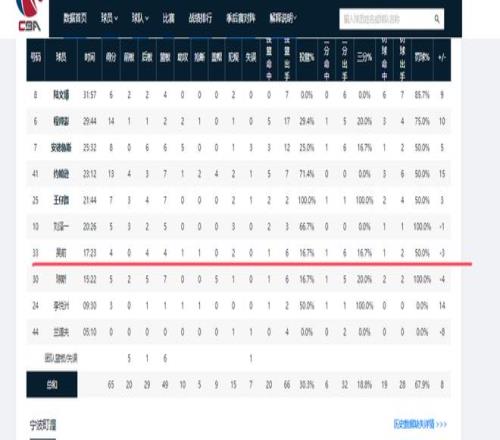 在12进8首轮浙江男篮65-57宁波男篮的比赛中,吴前全场三分6中1,仅为球队贡献4分,正负值-3,为全队倒数第三。